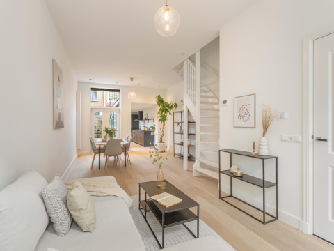 De trapopgang zit in het midden van de kamer waardoor er een leuke verdeling is ontstaan in een voorkamer en een achterkamer. De achterkamer is in gebruik als eetkamer. Ook hier treffen we een schouw en zin er openslaande deuren naar de leuke stadstuin.